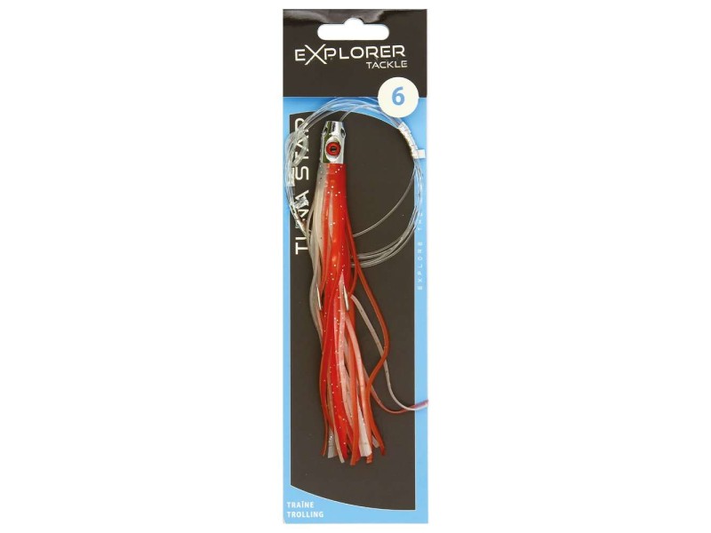 Les Tuna Star Explorer Tackle sont des leurres de traîne de type Big Game. Cette gamme ultra complète de jets est idéale pour la pêche des poissons trophées. Prêts à pêcher, ces jets sont prémontés avec un bas de ligne de 120 cm dont la boucle d’attache est sleevée et ils sont déjà armés d’un hameçon double fort de fer au piquant redoutable. Dotés d’une jupe haute densité de grande qualité, ces leurres sont conçus pour être utilisés seuls ou associés à un appât naturel (poisson entier ou filet).