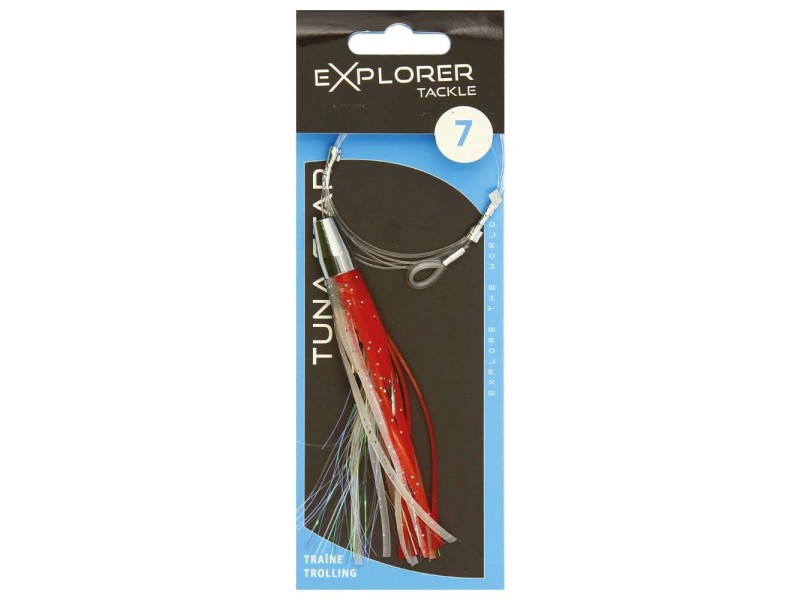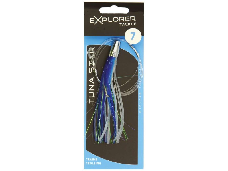 Les Tuna Star Explorer Tackle sont des leurres de traîne de type Big Game. Cette gamme ultra complète de jets est idéale pour la pêche des poissons trophées. Prêts à pêcher, ces jets sont prémontés avec un bas de ligne de 120 cm dont la boucle d’attache est sleevée et ils sont déjà armés d’un hameçon double fort de fer au piquant redoutable. Dotés d’une jupe haute densité de grande qualité, ces leurres sont conçus pour être utilisés seuls ou associés à un appât naturel (poisson entier ou filet).