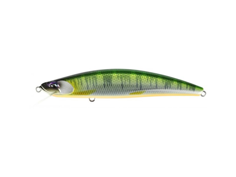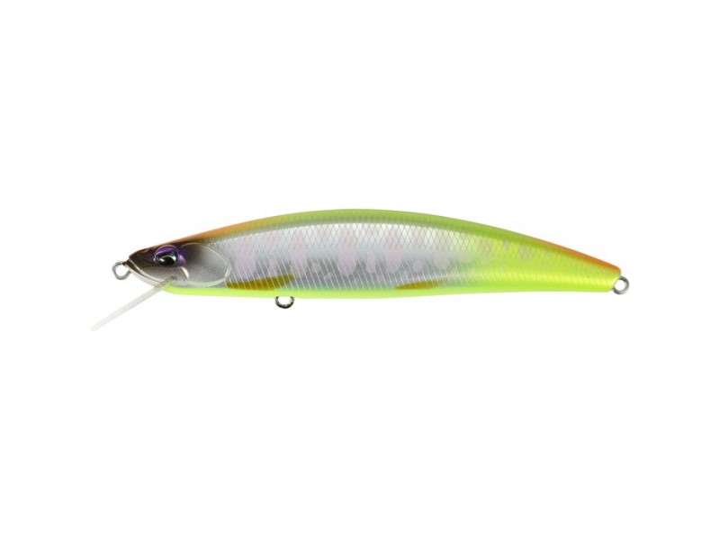 L’Onimasu Masakage 110F est un minnow flottant initialement développé au Japon pour la pêche de la truite en grande rivière. Il sera également très intéressant pour la recherche des prédateurs de nos milieux, en eau douce comme en mer. Sa conception générale et sa bavette en fibre lui permettent de rester parfaitement stable dans les courants les plus puissants et d’accepter des vitesses de récupération très rapides. Son action rolling associée à un wobbling particulièrement dynamique feront craquer à coup sûr bon nombre de carnassiers.