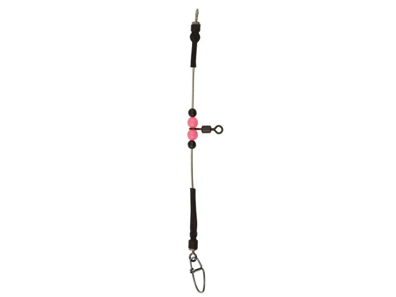 Ce connecteur est conçu dans une tige métallique inox robuste. Il dispose d’un rolling en haut pour l’attache de la ligne (ou de l’arraché). L’agrafe du bas permet un changement simple et rapide du plomb. Le rolling haut et l’œillet de l’agrafe sont enveloppés dans de la gaine rétractable afin d’éviter l’accumulation d’algues. Un rolling coulissant librement sur la tige sert à l’attache du traînard.