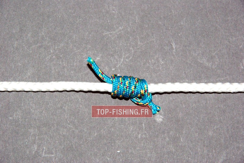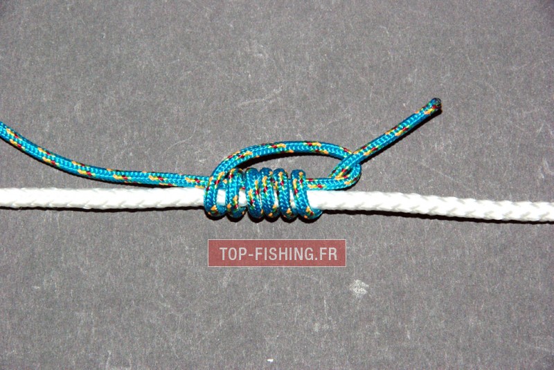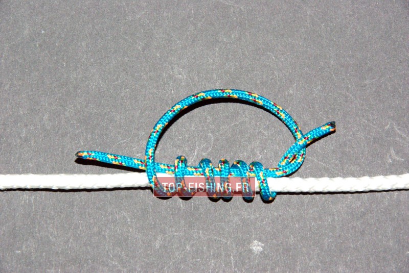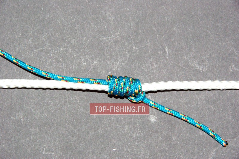 Ce nœud vous permettra d'avoir un point de blocage "coulissant dur" sur votre ligne qui passe parfaitement dans les anneaux. Vous enfilerez une simple perle sur la ligne juste au dessus d'un bouchon coulissant. La perle sera bloquée par le nœud et celle-ci bloquera le flotteur.